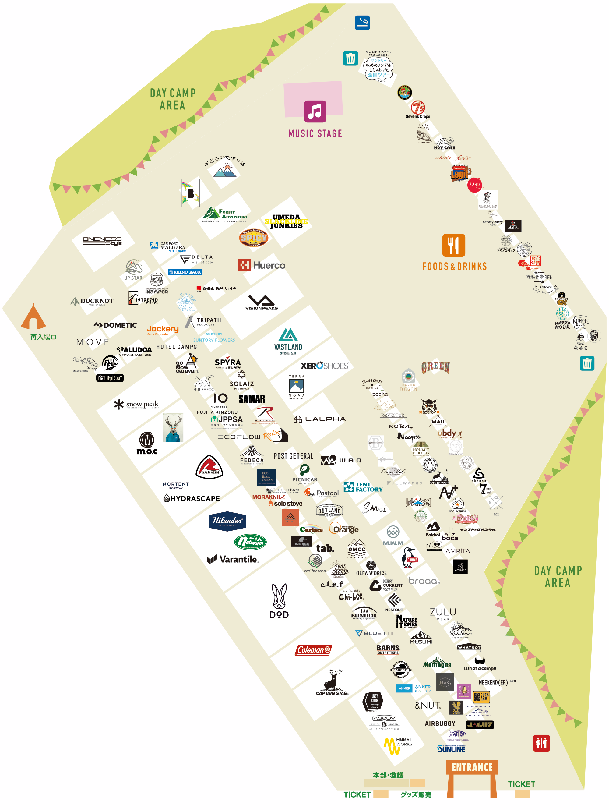 会場内には、「アウトドア:外遊び」にまつわるブースが多数出展し、アイテムの展示・販売を行います。