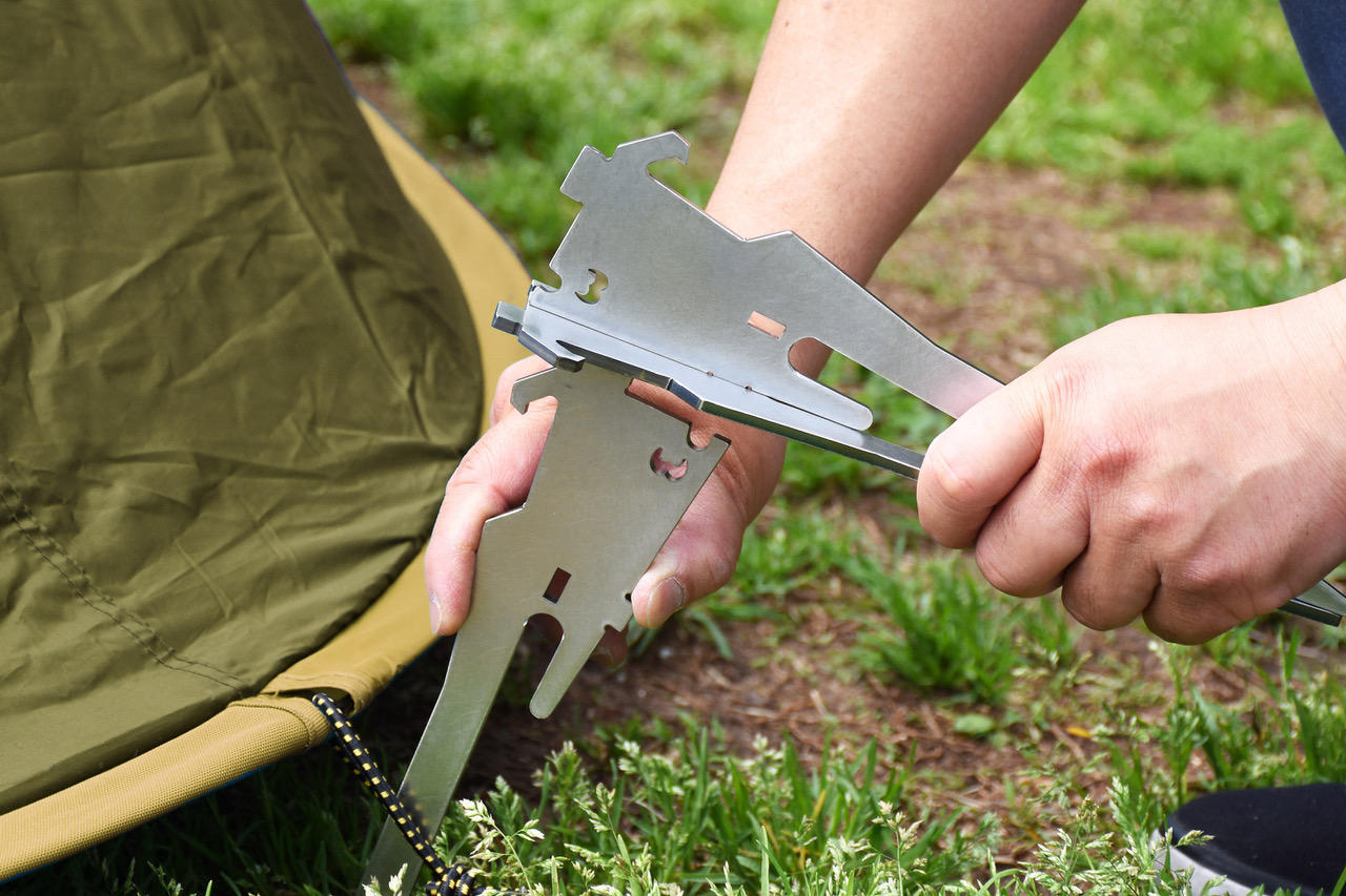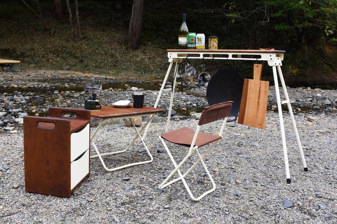 温かみのある木と鉄を組み合わせたアウトドアギア。今回はチェア、テーブルをご用意しております。